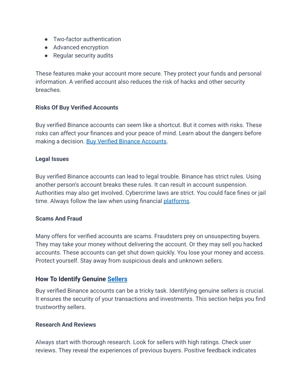 ● Two-factor authentication ● Advanced encryption ● Regular security audits These features make your account more secure. They protect your funds and personal information. A verified account also reduces the risk of hacks and other security breaches. Risks Of Buy Verified Accounts Buy verified Binance accounts can seem like a shortcut. But it comes with risks. These risks can affect your finances and your peace of mind. Learn about the dangers before making a decision. Buy Verified Binance Accounts. Legal Issues Buy verified Binance accounts can lead to legal trouble. Binance has strict rules. Using another person’s account breaks these rules. It can result in account suspension. Authorities may also get involved. Cybercrime laws are strict. You could face fines or jail time. Always follow the law when using financial platforms. Scams And Fraud Many offers for verified accounts are scams. Fraudsters prey on unsuspecting buyers. They may take your money without delivering the account. Or they may sell you hacked accounts. These accounts can get shut down quickly. You lose your money and access. Protect yourself. Stay away from suspicious deals and unknown sellers. How To Identify Genuine Sellers Buy verified Binance accounts can be a tricky task. Identifying genuine sellers is crucial. It ensures the security of your transactions and investments. This section helps you find trustworthy sellers. Research And Reviews Always start with thorough research. Look for sellers with high ratings. Check user reviews. They reveal the experiences of previous buyers. Positive feedback indicates