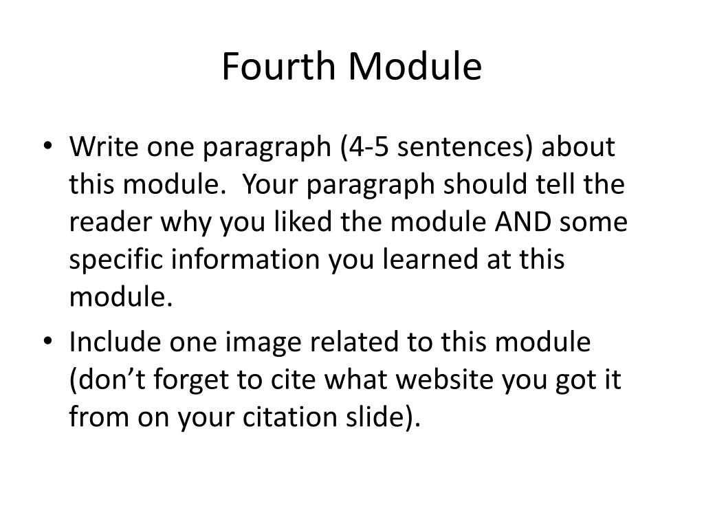 Fourth Module • Write one paragraph (4-5 sentences) about this module. Your paragraph should tell the reader why you liked the module AND some specific information you learned at this module. • Include one image related to this module (don’t forget to cite what website you got it from on your citation slide).