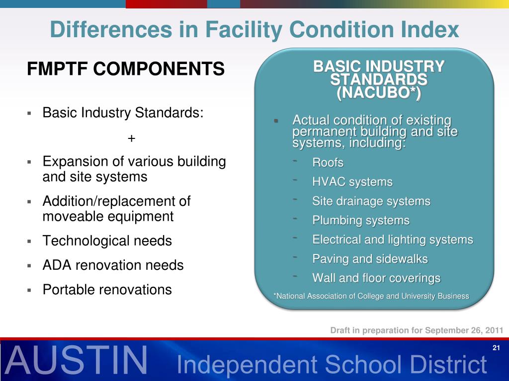 Differences in Facility Condition Index BASIC INDUSTRY STANDARDS(NACUBO*) Actual condition of existing permanent building and site systems, including: Roofs HVAC systems Site drainage systems Plumbing systems Electrical and lighting systems Paving and sidewalks Wall and floor coverings *National Association of College and University Business FMPTF COMPONENTS • Basic Industry Standards: + • Expansion of various building and site systems • Addition/replacement of moveable equipment • Technological needs • ADA renovation needs • Portable renovations Draft in preparation for September 26, 2011 21