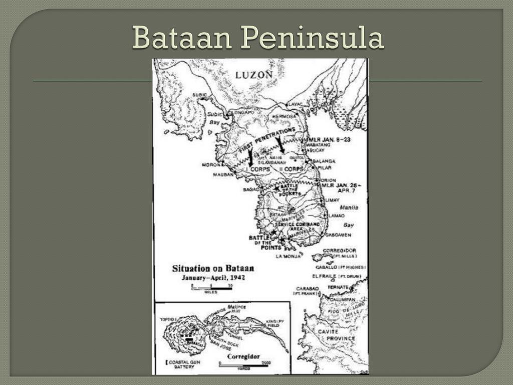 Fighting in the Philippines • Battle of Bataan: • General Douglass MacArthur • United States Army Forces in the Far East (USAFFE) • American & Filipino • Held out Against Imperial Army • 4 Months • By March • Entire Western Pacific • Japanese Control • Except Philippines • MacArthur's Orders: • Retreat to Bataan Peninsula • Rapid Evacuation • Supplies & Food