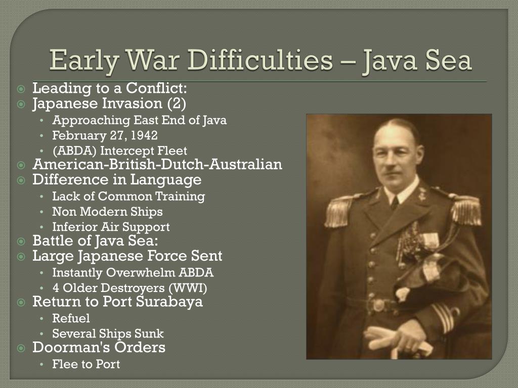 Early War Difficulties – Java Sea • Leading to a Conflict: • Japanese Invasion (2) • Approaching East End of Java • February 27, 1942 • (ABDA) Intercept Fleet • American-British-Dutch-Australian • Difference in Language • Lack of Common Training • Non Modern Ships • Inferior Air Support • Battle of Java Sea: • Large Japanese Force Sent • Instantly Overwhelm ABDA • 4 Older Destroyers (WWI) • Return to Port Surabaya • Refuel • Several Ships Sunk • Doorman's Orders • Flee to Port