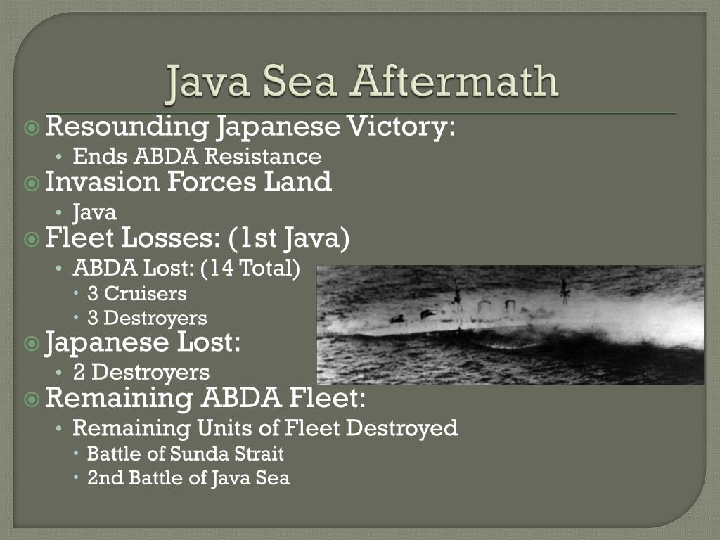 Java Sea Aftermath • Resounding Japanese Victory: • Ends ABDA Resistance • Invasion Forces Land • Java • Fleet Losses: (1st Java) • ABDA Lost: (14 Total) • 3 Cruisers • 3 Destroyers • Japanese Lost: • 2 Destroyers • Remaining ABDA Fleet: • Remaining Units of Fleet Destroyed • Battle of Sunda Strait • 2nd Battle of Java Sea