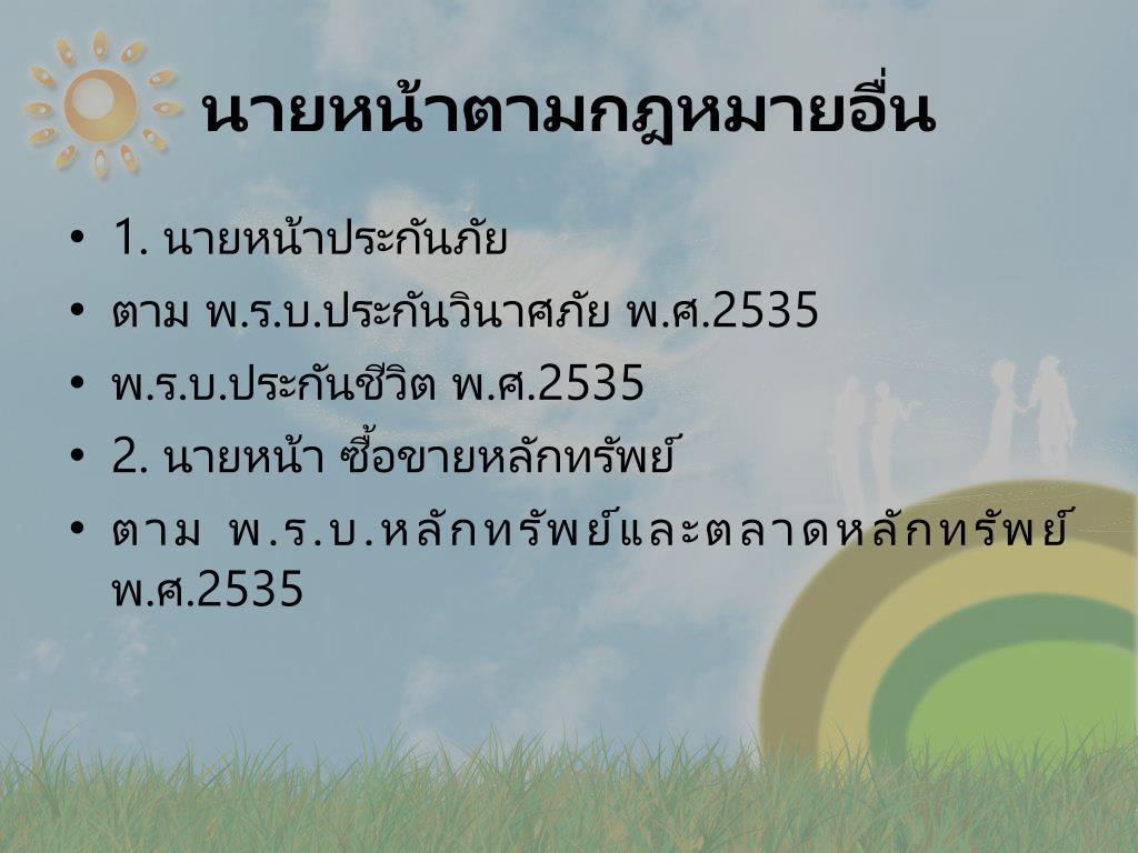 นายหน้าตามกฎหมายอื่น • 1. นายหน้าประกันภัย • ตาม พ.ร.บ.ประกันวินาศภัย พ.ศ.2535 • พ.ร.บ.ประกันชีวิต พ.ศ.2535 • 2. นายหน้า ซื้อขายหลักทรัพย์ • ตาม พ.ร.บ.หลักทรัพย์และตลาดหลักทรัพย์พ.ศ.2535