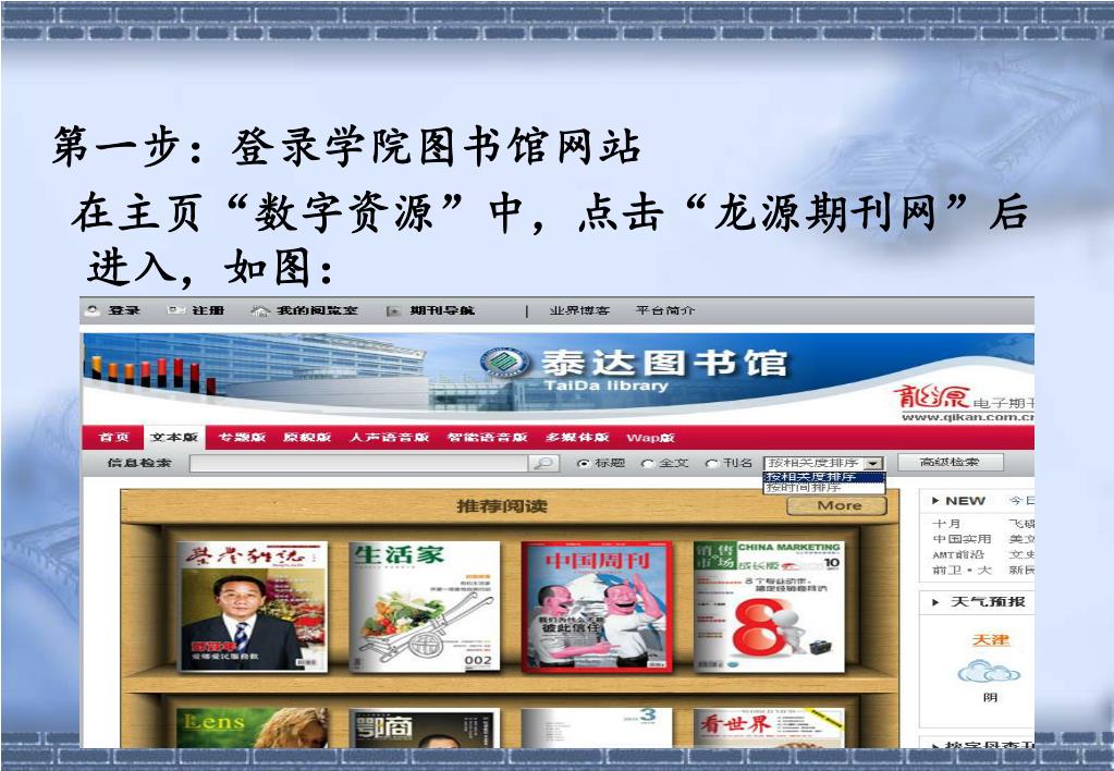 数据库使用指南. 龙源期刊网 简介: 龙源电子期刊网络出版与阅读平台将 2685 种人文大众类数字化期刊杂志按时事政治、现代文学、文化艺术、管理财经等九大类进行归集整理,每个大类的每种刊物都是以整刊现刊网络出版的方式呈现,供读者 “ 取刊 ” 使用,方便阅读。. 第一步:登录学院图书馆网站 在主页 “ 数字资源 ” 中,点击 “ 龙源期刊网 ” 后进入,如图:. 第二步: 1 、可以在检索框中输入检索词 , 选择“标题”或“全文”或“刊名” ,可在下拉菜单选择“按相关度排序”或“按时间排序”,然后点击“放大镜图标”进行检索 . 如图:.