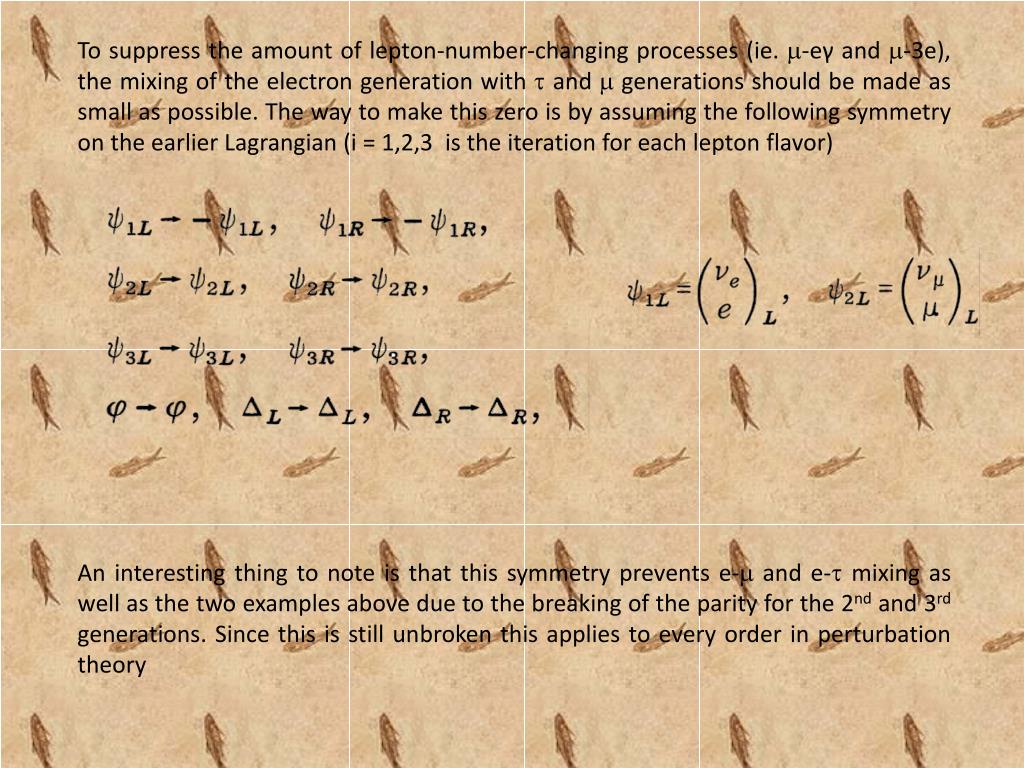 To suppress the amount of lepton-number-changing processes (ie. -eγ and -3e), the mixing of the electron generation with and generations should be made as small as possible.The way to make this zero is by assuming the following symmetry on the earlier Lagrangian (i = 1,2,3 is the iteration for each lepton flavor) • An interesting thing to note is that this symmetry prevents e- and e-mixing as well as the two examples above due to the breaking of the parity for the 2nd and 3rd generations. Since this is still unbroken this applies to every order in perturbation theory