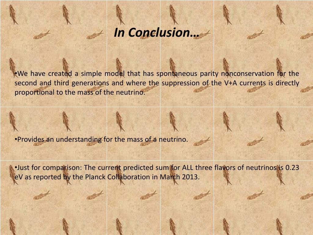 In Conclusion… • We have created a simple model that has spontaneous parity nonconservation for the second and third generations and where the suppression of the V+A currents is directly proportional to the mass of the neutrino. • Provides an understanding for the mass of a neutrino. • Just for comparison: The current predicted sum for ALL three flavors of neutrinos is 0.23 eV as reported by the Planck Collaboration in March 2013.