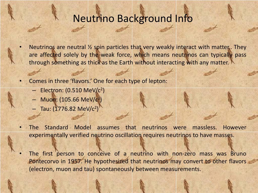 Neutrino Background Info • Neutrinos are neutral ½ spin particles that very weakly interact with matter.. They are affected solely by the weak force, which means neutrinos can typically pass through something as thick as the Earth without interacting with any matter. • Comes in three ‘flavors.’ One for each type of lepton: • Electron: (0.510 MeV/c2) • Muon: (105.66 MeV/c2) • Tau: (1776.82 MeV/c2) • The Standard Model assumes that neutrinos were massless. However experimentally verified neutrino oscillation requires neutrinos to have masses. • The first person to conceive of a neutrino with non-zero mass was Bruno Pontecorvo in 1957. He hypothesized that neutrinos may convert to other flavors (electron, muon and tau) spontaneously between measurements.