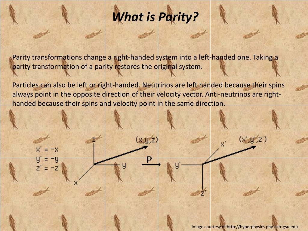 What is Parity? Parity transformations change a right-handed system into a left-handed one. Taking a parity transformation of a parity restores the original system. Particles can also be left or right-handed. Neutrinos are left handed because their spins always point in the opposite direction of their velocity vector. Anti-neutrinos are right-handed because their spins and velocity point in the same direction. Image courtesy of http://hyperphysics.phy-astr.gsu.edu