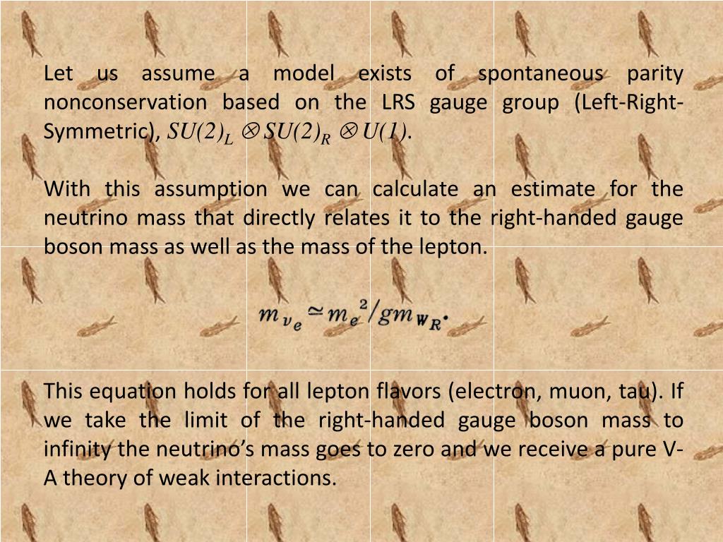 At the time of publication the level of experimental accuracy did not allow for any distinguishing differences to be seen between the standard model gauge group SU(2)L U(1) and the hypothesized group SU(2)L SU(2)R U(1) when it came to the structure of the neutrino neutral-current interactions and the parity-nonconserving electron-hadron weak interactions. • A big difference between the two gauge groups is how they deal with the neutrino: • The Left-Handed model, SU(2)L U(1), says that the neutrino has no mass. • The Left-Right-Symmetric Model, SU(2)L SU(2)R U(1), suggests that the neutrino has an extremely small, but non-zero, mass. • This made it important to fully understand just how small the neutrino mass is in the Left-Right-Symmetric Model