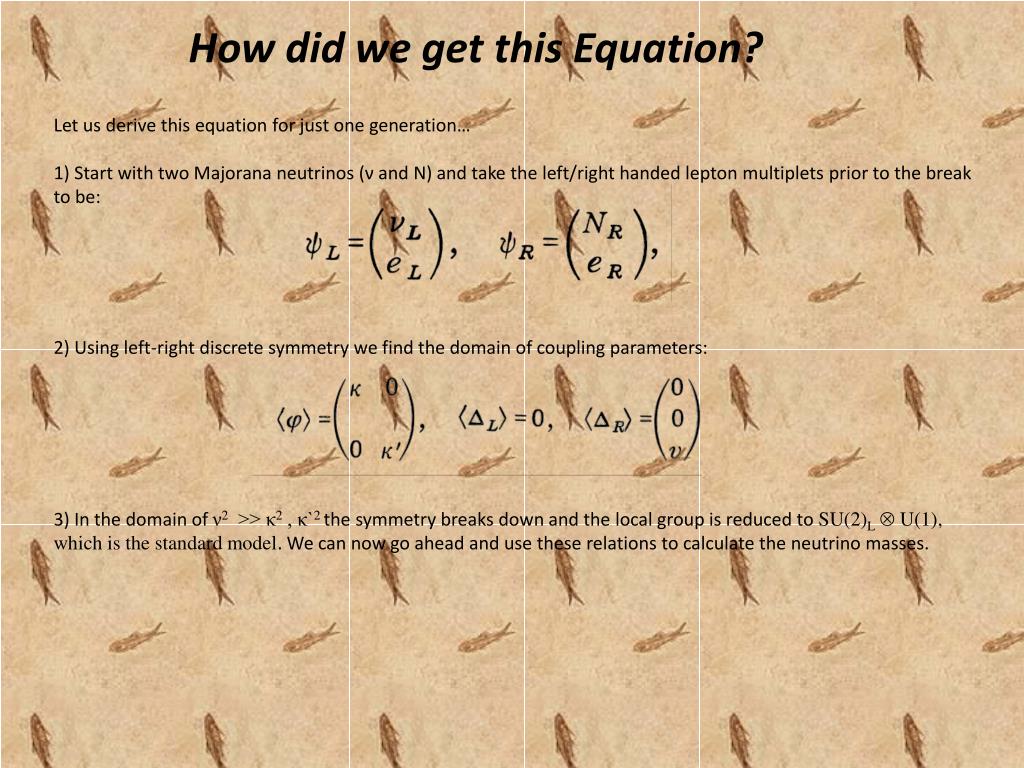 How did we get this Equation? Let us derive this equation for just one generation… 1) Start with two Majorana neutrinos (ν and N) and take the left/right handed lepton multiplets prior to the break to be: 2) Using left-right discrete symmetry we find the domain of coupling parameters: 3) In the domain of ν2 >> κ2 , κ`2 the symmetry breaks down and the local group is reduced to SU(2)L U(1), which is the standard model. We can now go ahead and use these relations to calculate the neutrino masses.