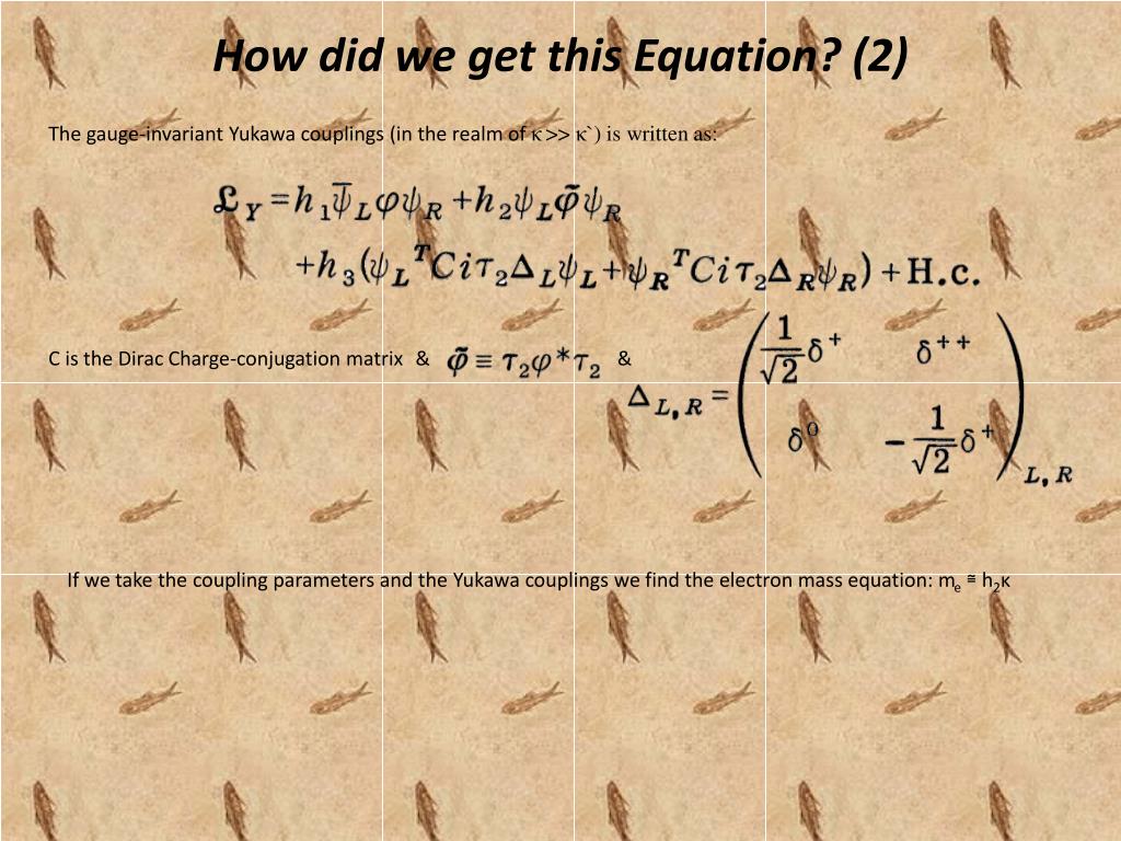 How did we get this Equation? (2) The gauge-invariant Yukawa couplings (in the realm of κ>> κ`) is written as: C is the Dirac Charge-conjugation matrix & & If we take the coupling parameters and the Yukawa couplings we find the electron mass equation: me≅ h2κ