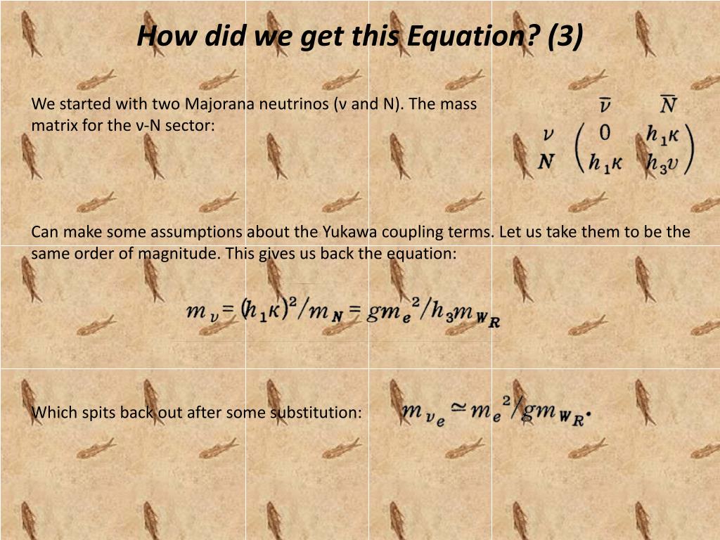 How did we get this Equation? (3) We started with two Majorana neutrinos (ν and N). The mass matrix for the ν-N sector: Can make some assumptions about the Yukawa coupling terms. Let us take them to be the same order of magnitude. This gives us back the equation: Which spits back out after some substitution: