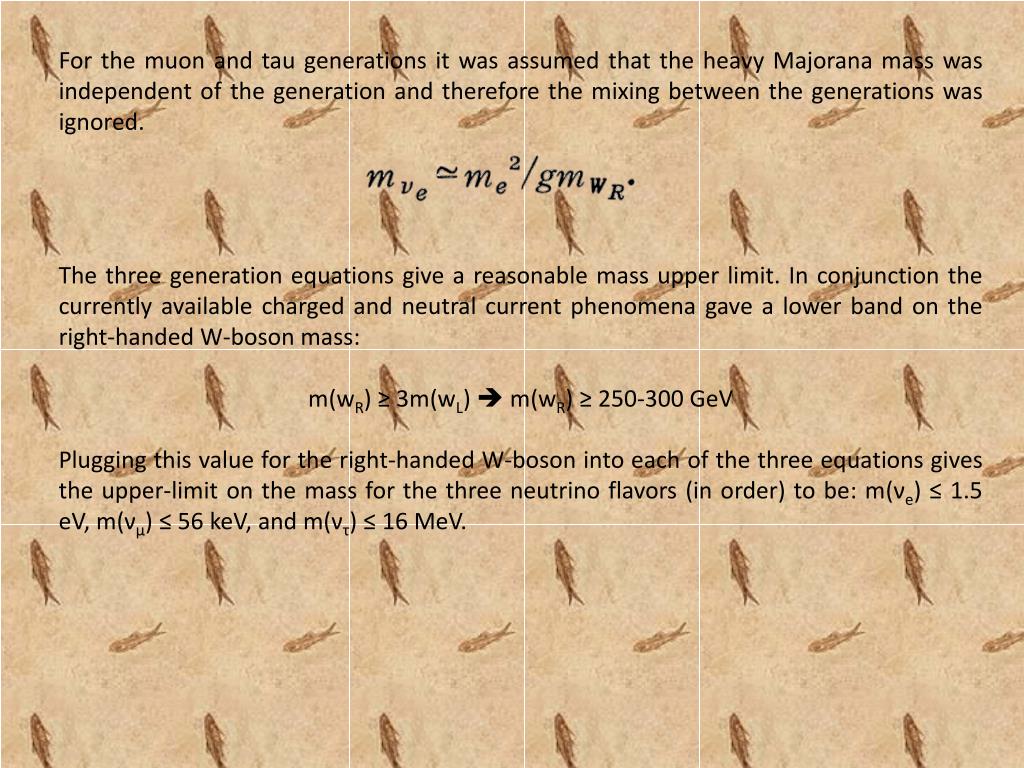 For the muon and tau generations it was assumed that the heavy Majorana mass was independent of the generation and therefore the mixing between the generations was ignored. The three generation equations give a reasonable mass upper limit. In conjunction the currently available charged and neutral current phenomena gave a lower band on the right-handed W-boson mass: m(wR) ≥ 3m(wL) m(wR) ≥ 250-300 GeV Plugging this value for the right-handed W-boson into each of the three equations gives the upper-limit on the mass for the three neutrino flavors (in order) to be: m(νe) ≤ 1.5 eV, m(νμ) ≤ 56 keV, and m(ντ) ≤ 16 MeV.