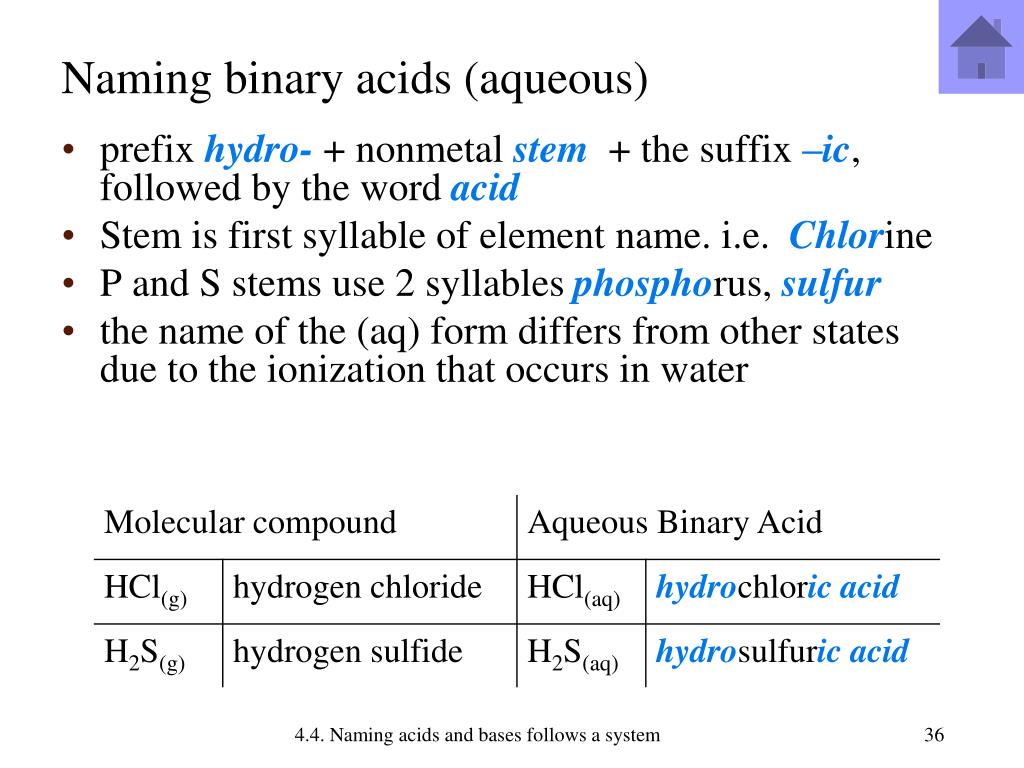Naming binary acids (aqueous) • prefix hydro- + nonmetal stem + the suffix –ic, followed by the word acid • Stem is first syllable of element name. i.e. Chlorine • P and S stems use 2 syllables phosphorus, sulfur • the name of the (aq) form differs from other states due to the ionization that occurs in water 4.4. Naming acids and bases follows a system