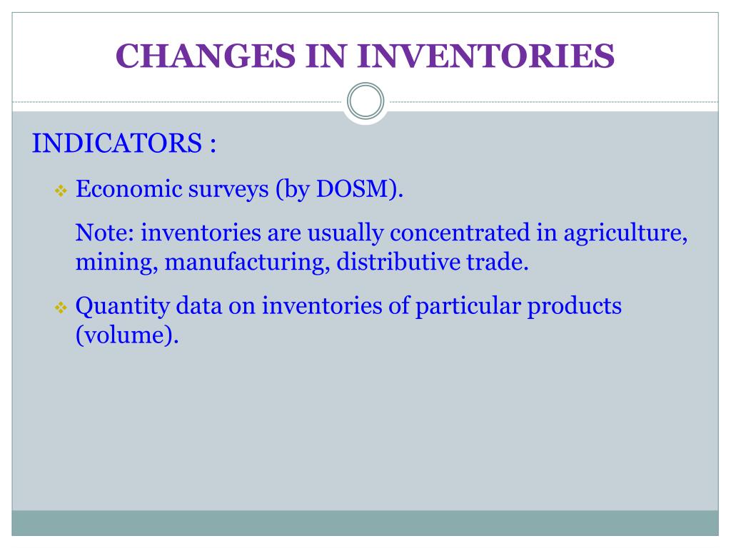CHANGES IN INVENTORIES INDICATORS : • Economic surveys (by DOSM). Note: inventories are usually concentrated in agriculture, mining, manufacturing, distributive trade. • Quantity data on inventories of particular products (volume).