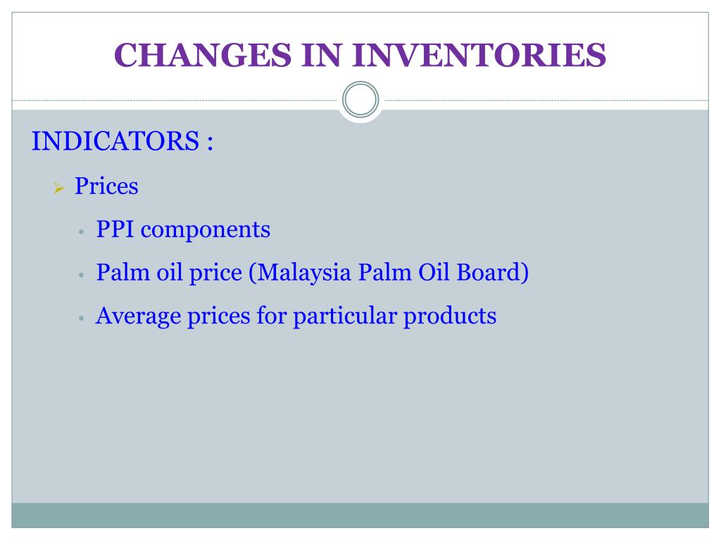 CHANGES IN INVENTORIES INDICATORS : • Prices • PPI components • Palm oil price (Malaysia Palm Oil Board) • Average prices for particular products