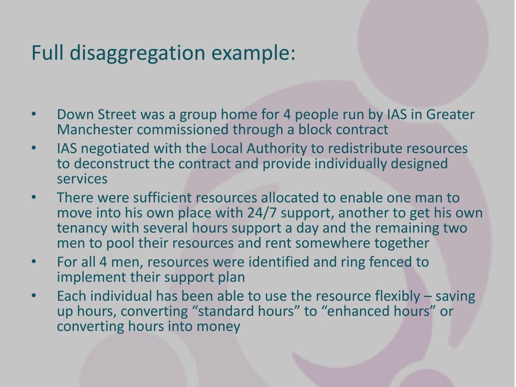Full disaggregation example: • Down Street was a group home for 4 people run by IAS in Greater Manchester commissioned through a block contract • IAS negotiated with the Local Authority to redistribute resources to deconstruct the contract and provide individually designed services • There were sufficient resources allocated to enable one man to move into his own place with 24/7 support, another to get his own tenancy with several hours support a day and the remaining two men to pool their resources and rent somewhere together • For all 4 men, resources were identified and ring fenced to implement their support plan • Each individual has been able to use the resource flexibly – saving up hours, converting “standard hours” to “enhanced hours” or converting hours into money