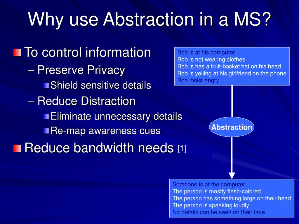 Why use Abstraction in a MS? Bob is at his computer Bob is not wearing clothes Bob is has a fruit-basket hat on his head Bob is yelling at his girlfriend on the phone Bob looks angry • To control information • Preserve Privacy • Shield sensitive details • Reduce Distraction • Eliminate unnecessary details • Re-map awareness cues • Reduce bandwidth needs Abstraction [1] Someone is at the computer The person is mostly flesh-colored The person has something large on their head The person is speaking loudly No details can be seen on their face