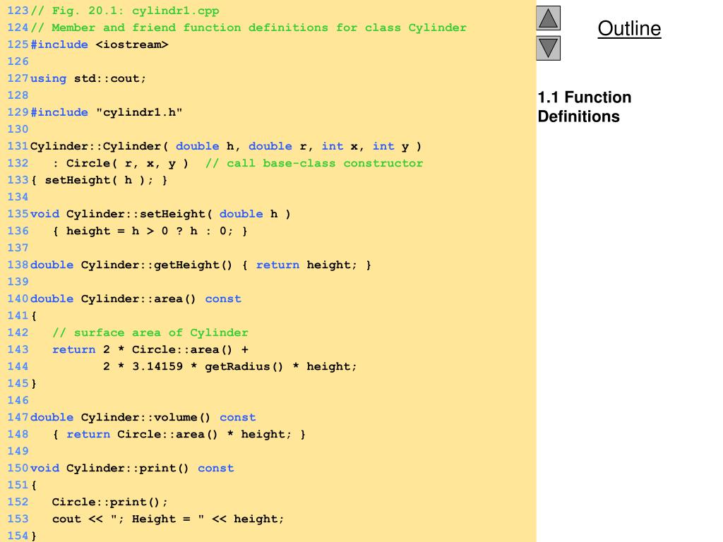 123 // Fig. 20.1: cylindr1.cpp 124 // Member and friend function definitions for class Cylinder 125 #include <iostream> 126 127 using std::cout; 128 129 #include "cylindr1.h" 130 131 Cylinder::Cylinder( double h, double r, int x, int y ) 132 : Circle( r, x, y ) // call base-class constructor 133 { setHeight( h ); } 134 135 void Cylinder::setHeight( double h ) 136 { height = h > 0 ? h : 0; } 137 138 double Cylinder::getHeight() { return height; } 139 140 double Cylinder::area() const 141 { 142 // surface area of Cylinder 143 return 2 * Circle::area() + 144 2 * 3.14159 * getRadius() * height; 145 } 146 147 double Cylinder::volume() const 148 { return Circle::area() * height; } 149 150 void Cylinder::print() const 151 { 152 Circle::print(); 153 cout << "; Height = " << height; 154 } 1.1 Function Definitions