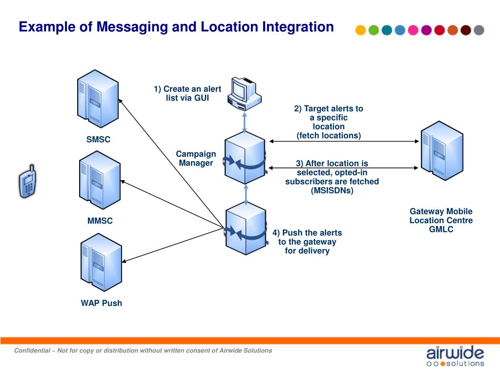 Example of Messaging and Location Integration 1) Create an alert list via GUI 2) Target alerts to a specific location (fetch locations) SMSC Campaign Manager 3) After location is selected, opted-in subscribers are fetched (MSISDNs) Gateway Mobile Location Centre GMLC MMSC 4) Push the alerts to the gateway for delivery WAP Push