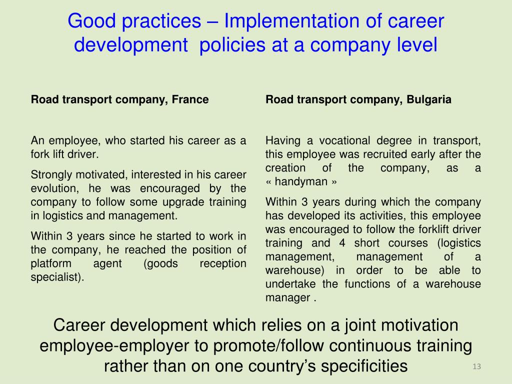 Good practices – Implementation of careerdevelopmentpoliciesata companylevel Road transport company, France An employee, who started his career as a fork lift driver. Strongly motivated, interested in his career evolution, he was encouraged by the company to follow some upgrade training in logistics and management. Within 3 years since he started to work in the company, he reached the position of platform agent (goods reception specialist). Road transport company, Bulgaria Having a vocationaldegree in transport, thisemployeewasrecruitedearlyafter the creation of the company, as a « handyman » Within 3 yearsduringwhich the company has developeditsactivities, thisemployeewasencouraged to follow the forklift driver training and 4 short courses (logistics management, management of a warehouse) in order to be able to undertake the functions of a warehouse manager . Careerdevelopmentwhich relies on a joint motivation employee-employer to promote/followcontinuous training ratherthan on one country’sspecificities