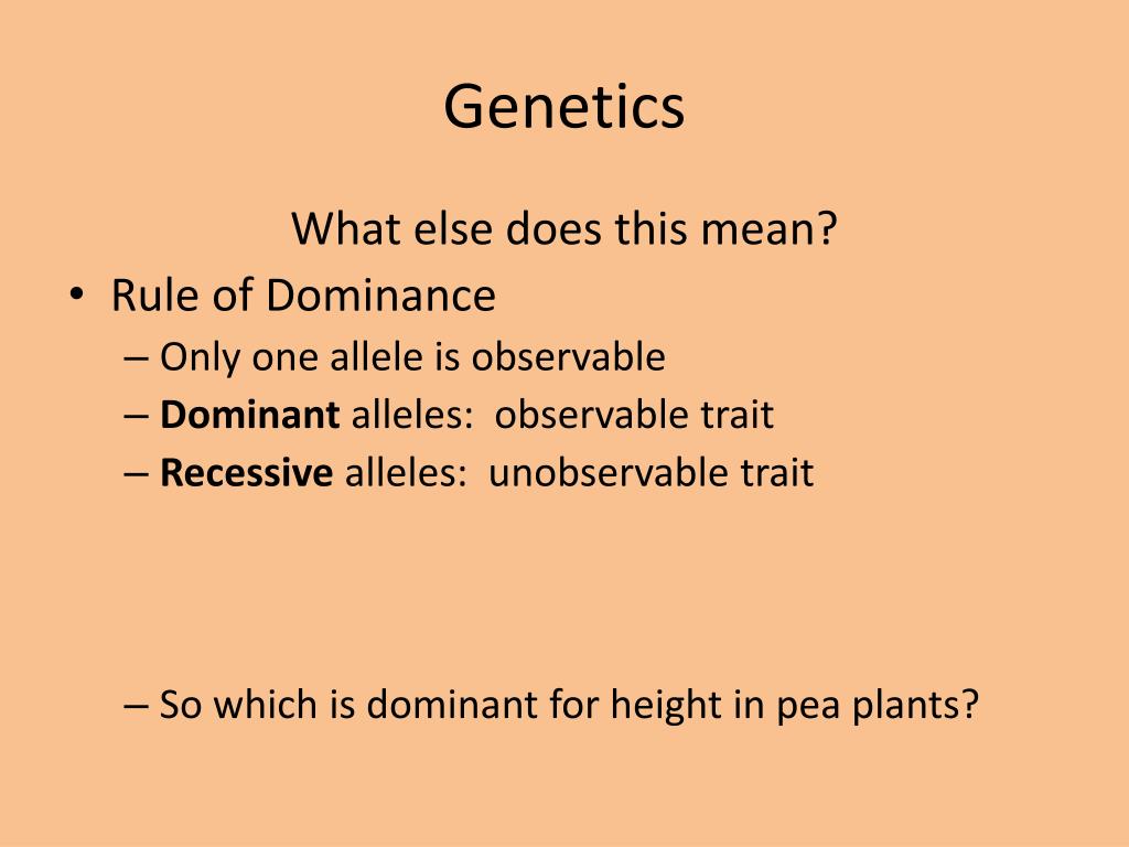 Genetics What else does this mean? • Rule of Dominance • Only one allele is observable • Dominant alleles: observable trait • Recessive alleles: unobservable trait • So which is dominant for height in pea plants?