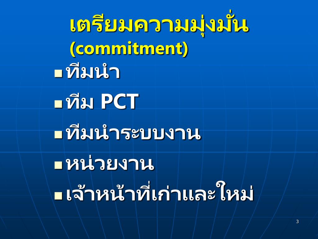 เตรียมความมุ่งมั่น (commitment) • ทีมนำ • ทีม PCT • ทีมนำระบบงาน • หน่วยงาน • เจ้าหน้าที่เก่าและใหม่