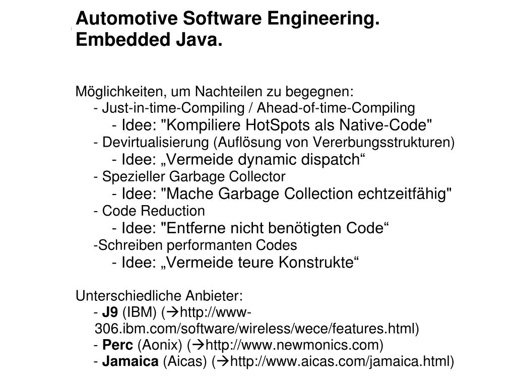 Automotive Software Engineering.Embedded Java. • Möglichkeiten, um Nachteilen zu begegnen: • Just-in-time-Compiling / Ahead-of-time-Compiling • Idee: "Kompiliere HotSpots als Native-Code" • Devirtualisierung (Auflösung von Vererbungsstrukturen) • Idee: „Vermeide dynamicdispatch“ • Spezieller GarbageCollector • Idee: "Mache GarbageCollection echtzeitfähig" • Code Reduction • Idee: "Entferne nicht benötigten Code“ • Schreiben performanten Codes • Idee: „Vermeide teure Konstrukte“ Unterschiedliche Anbieter: • J9 (IBM) (http://www- 306.ibm.com/software/wireless/wece/features.html) • Perc (Aonix) (http://www.newmonics.com) • Jamaica (Aicas) (http://www.aicas.com/jamaica.html)