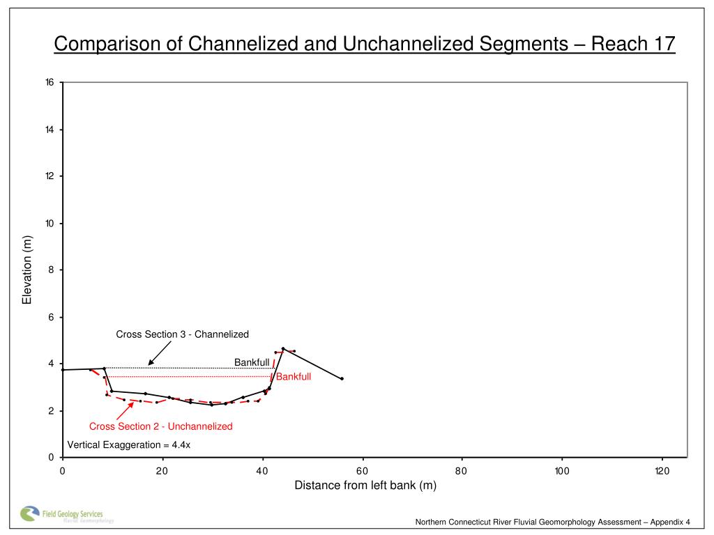 Comparison of Channelized and Unchannelized Segments – Reach 17 Elevation (m) Cross Section 3 - Channelized Bankfull Bankfull Cross Section 2 - Unchannelized Vertical Exaggeration = 4.4x Distance from left bank (m) Northern Connecticut River Fluvial Geomorphology Assessment – Appendix 4