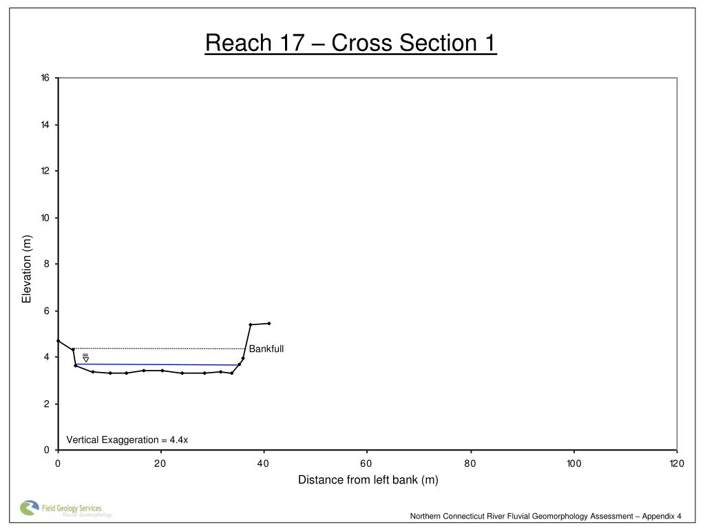 Reach 17 – Cross Section 1 Elevation (m) Bankfull Vertical Exaggeration = 4.4x Distance from left bank (m) Northern Connecticut River Fluvial Geomorphology Assessment – Appendix 4