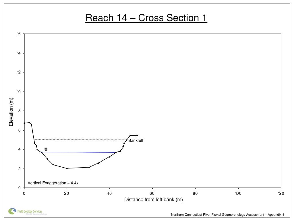 Reach 14 – Cross Section 1 Elevation (m) Bankfull Vertical Exaggeration = 4.4x Distance from left bank (m) Northern Connecticut River Fluvial Geomorphology Assessment – Appendix 4