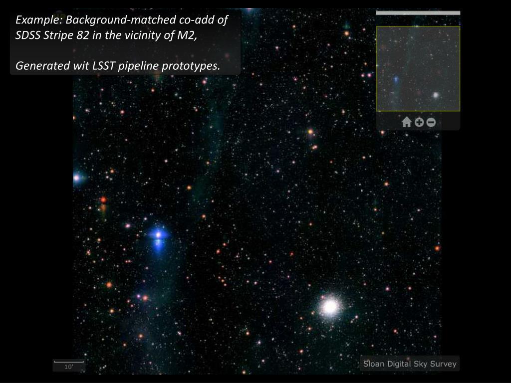 Algorithms: Co-adds w. background matching Example: Background-matched co-add of SDSS Stripe 82 in the vicinity of M2,Generated wit LSST pipeline prototypes.