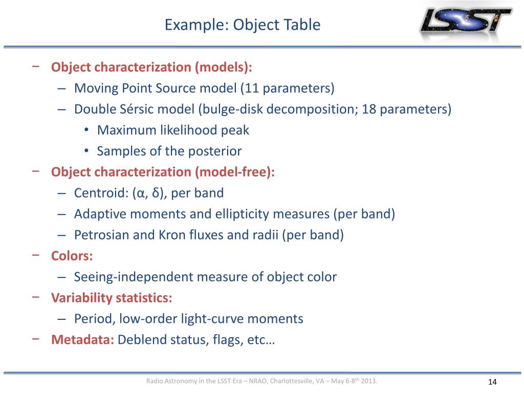 Example: Object Table • Object characterization (models): • Moving Point Source model (11 parameters) • Double Sérsic model (bulge-disk decomposition; 18 parameters) • Maximum likelihood peak • Samples of the posterior • Object characterization (model-free): • Centroid: (α, δ), per band • Adaptive moments and ellipticity measures (per band) • Petrosian and Kron fluxes and radii(per band) • Colors: • Seeing-independent measure of object color • Variability statistics: • Period, low-order light-curve moments • Metadata:Deblend status, flags, etc…