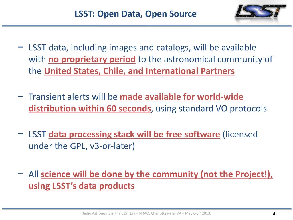 LSST: Open Data, Open Source • LSST data, including images and catalogs, will be available with no proprietary period to the astronomical community of the United States, Chile, and International Partners • Transient alerts will be made available for world-wide distribution within 60 seconds, using standard VO protocols • LSST data processing stack will be free software (licensed under the GPL, v3-or-later) • All science will be done by the community (not the Project!), using LSST’s data products