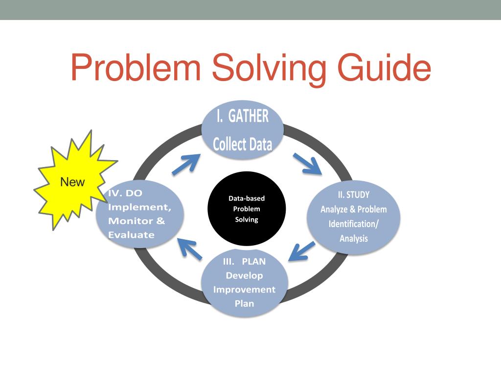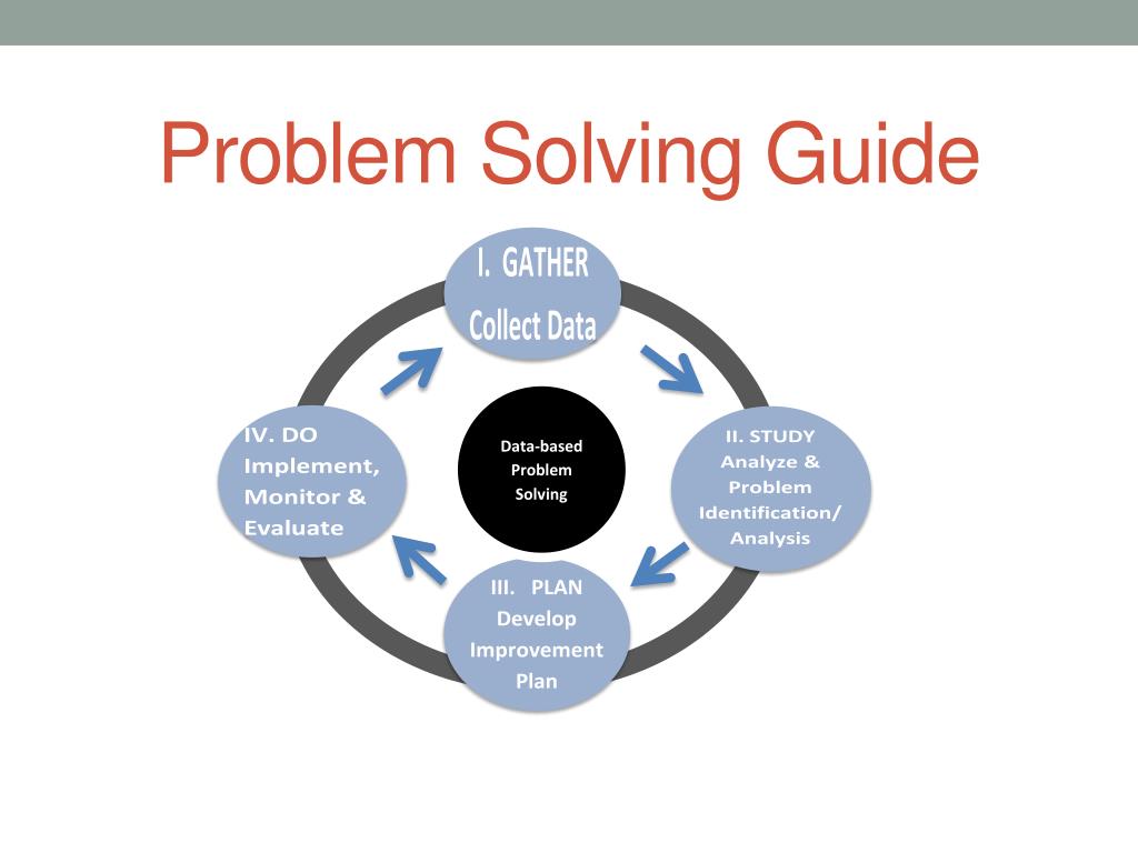 I. GATHER Collect Data Problem Solving Guide Data-based Problem Solving IV. DO Implement, Monitor & Evaluate II. STUDY Analyze & Problem Identification/ Analysis III. PLAN Develop Improvement Plan
