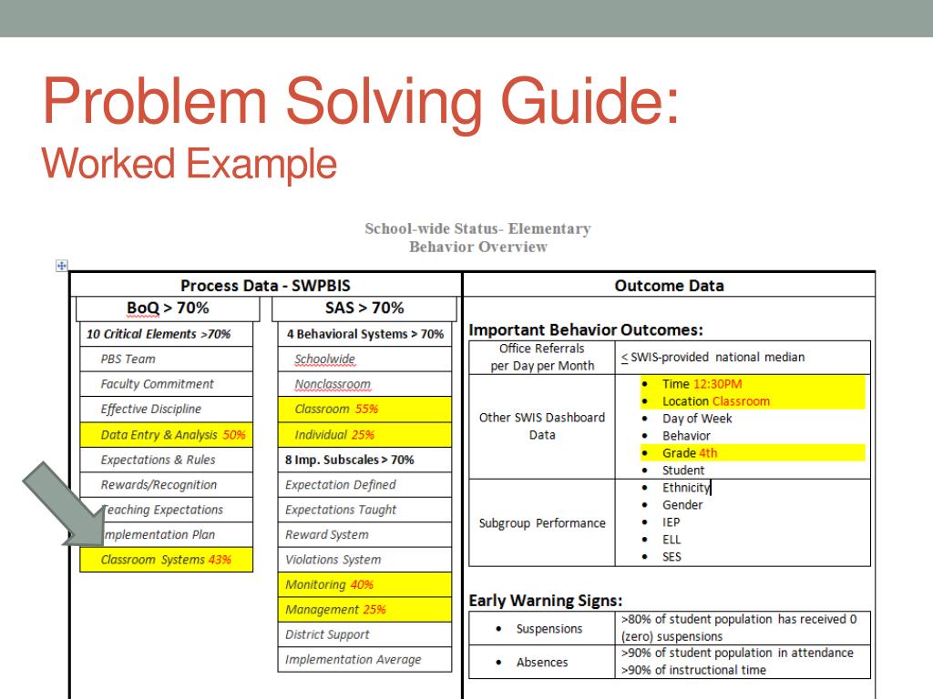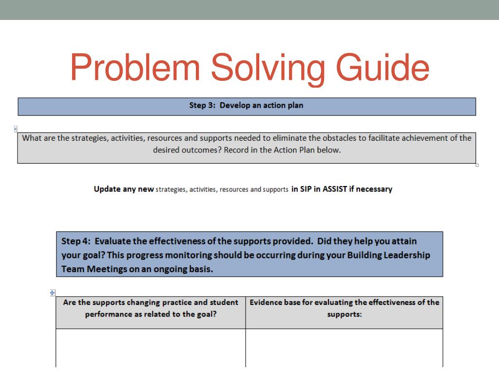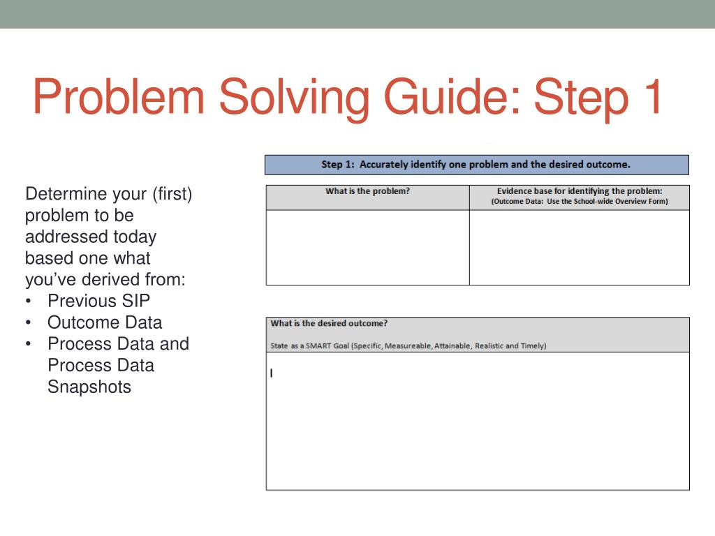 Problem Solving Guide: Step 1 • Determine your (first) problem to be addressed today based one what you’ve derived from: • Previous SIP • Outcome Data • Process Data and Process Data Snapshots