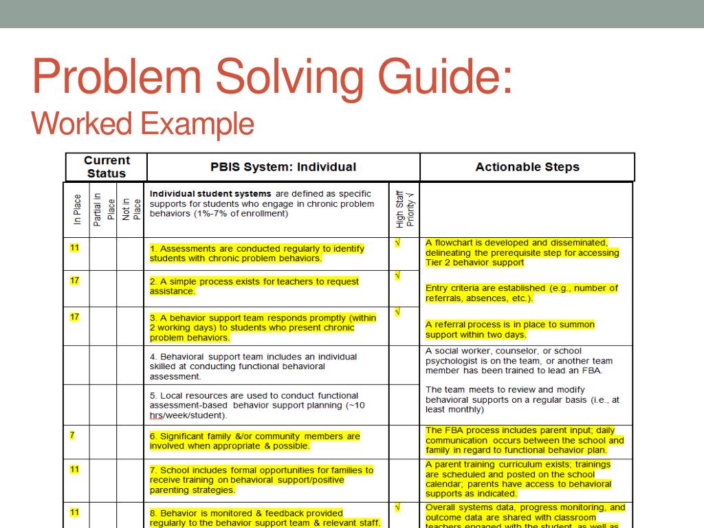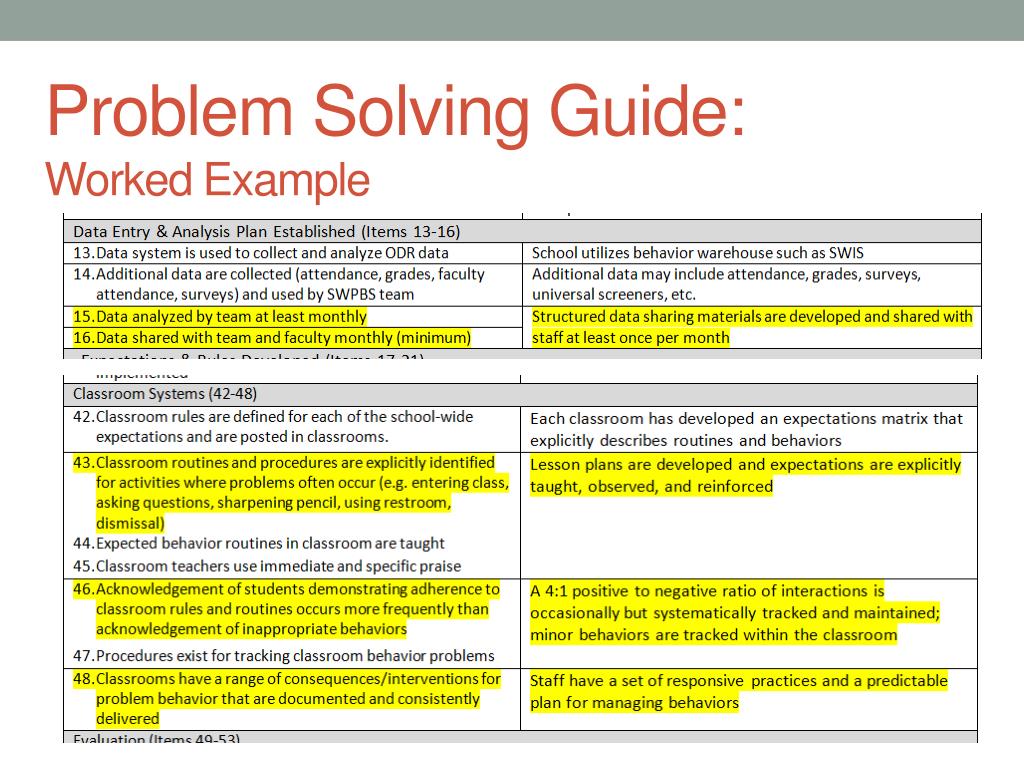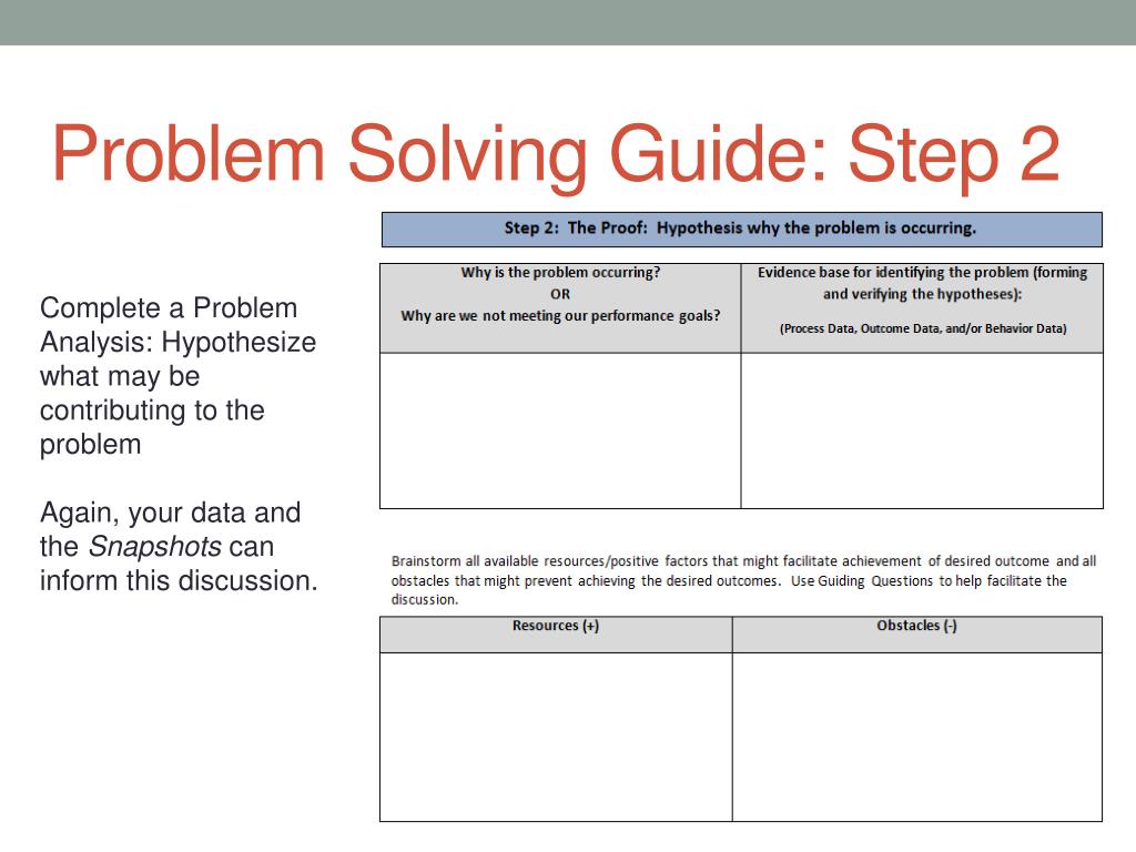 Problem Solving Guide: Step 2 Complete a Problem Analysis: Hypothesize what may be contributing to the problem Again, your data and the Snapshots can inform this discussion.