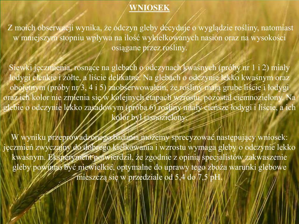 WNIOSEK Z moich obserwacji wynika, że odczyn gleby decyduje o wyglądzie rośliny, natomiast w mniejszym stopniu wpływa na ilość wykiełkowanych nasion oraz na wysokości osiągane przez rośliny. Siewki jęczmienia, rosnące na glebach o odczynach kwaśnych (próby nr 1 i 2) miały łodygi cienkie i żółte, a liście delikatne. Na glebach o odczynie lekko kwaśnym oraz obojętnym (próby nr 3, 4 i 5) zaobserwowałem, że rośliny mają grube liście i łodygi oraz ich kolor nie zmienia się w kolejnych etapach wzrostu, pozostał ciemnozielony. Na glebie o odczynie lekko zasadowym (próba 6) rośliny miały cieńsze łodygi i liście, a ich kolor był jasnozielony. W wyniku przeprowadzonego badania możemy sprecyzować następujący wniosek: jęczmień zwyczajny do dobrego kiełkowania i wzrostu wymaga gleby o odczynie lekko kwaśnym. Eksperyment potwierdził, że zgodnie z opinią specjalistów zakwaszenie gleby powinno być niewielkie, optymalne do uprawy tego zboża warunki glebowe mieszczą się w przedziale od 5,4 do 7,5 pH.