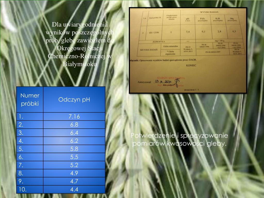 Dla uwiarygodnienia wyników poszczególnych prób, glebę zawiozłem do Okręgowej Stacji Chemiczno-Rolniczej w Białymstoku Potwierdzenie i sprecyzowanie pomiarów kwasowości gleby.