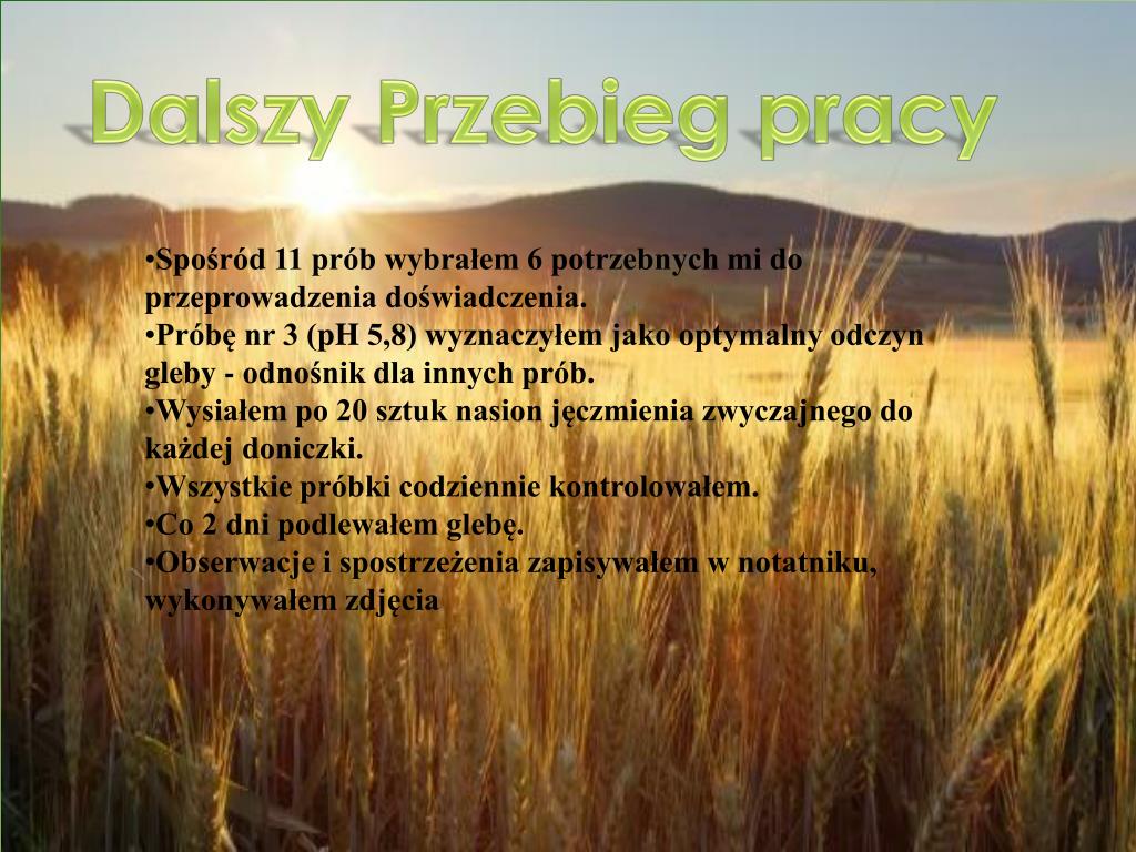 Praca naukowo – badawcza gimnazjalisty. WPŁYW ODCZYNU GLEBY NA KIEŁKOWANIE I WZROST JĘCZMIENIA ZWYCZAJNEGO (JAREGO ) I nagroda w konkursie „Praca naukowo-badawcza gimnazjalisty”. Przebieg pracy. Przygotowałem potrzebną do eksperymentu glebę. Oczyściłem glebę i zmierzyłem jej pH .