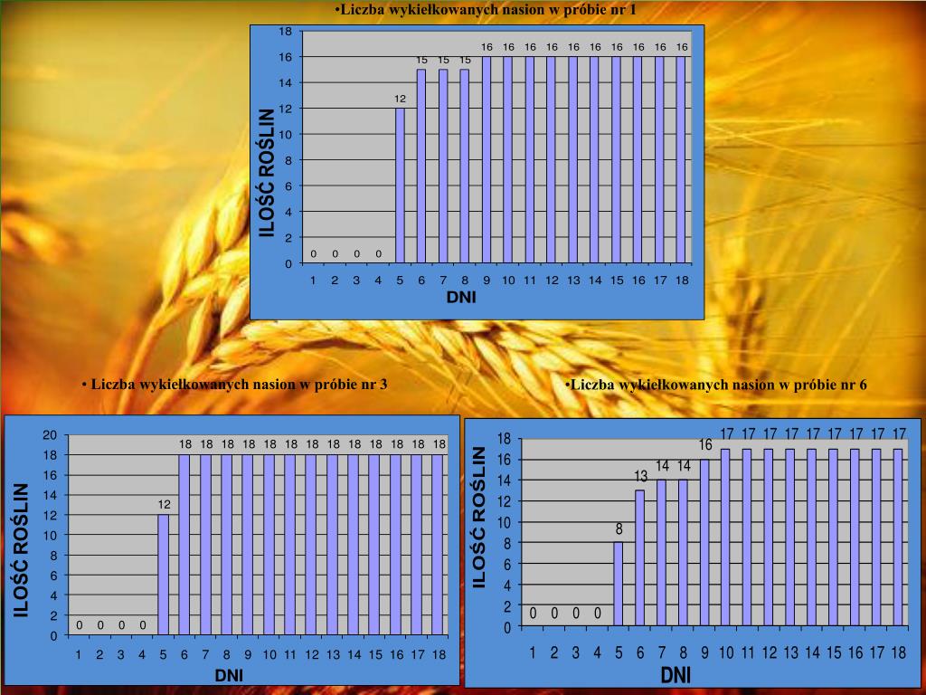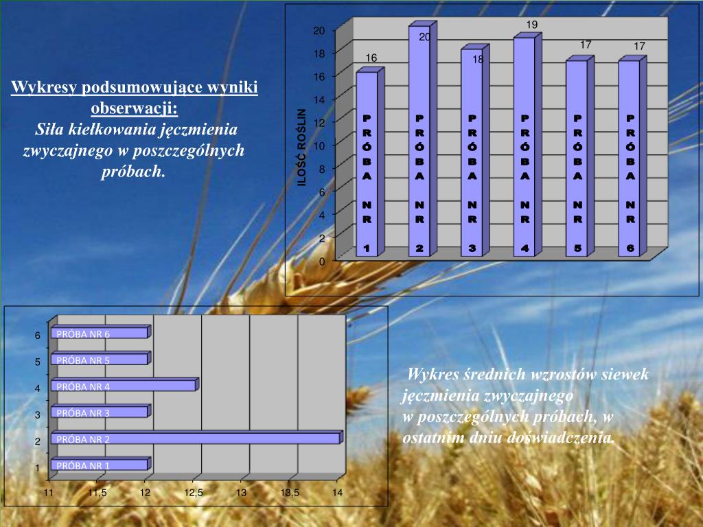 PRÓBA NR 6 PRÓBA NR 5 PRÓBA NR 4 PRÓBA NR 3 PRÓBA NR 2 PRÓBA NR 1 Wykresy podsumowujące wyniki obserwacji: Siła kiełkowania jęczmienia zwyczajnego w poszczególnych próbach. PRÓBA NR 1 PRÓBA NR 2 PRÓBA NR 3 PRÓBA NR 4 PRÓBA NR 5 PRÓBA NR 6 Wykres średnich wzrostów siewek jęczmienia zwyczajnego w poszczególnych próbach, w ostatnim dniu doświadczenia.