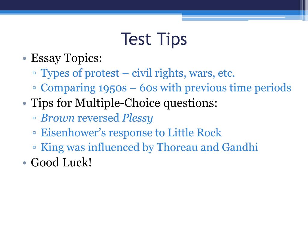Test Tips • Essay Topics: • Types of protest – civil rights, wars, etc. • Comparing 1950s – 60s with previous time periods • Tips for Multiple-Choice questions: • Brown reversed Plessy • Eisenhower’s response to Little Rock • King was influenced by Thoreau and Gandhi • Good Luck!