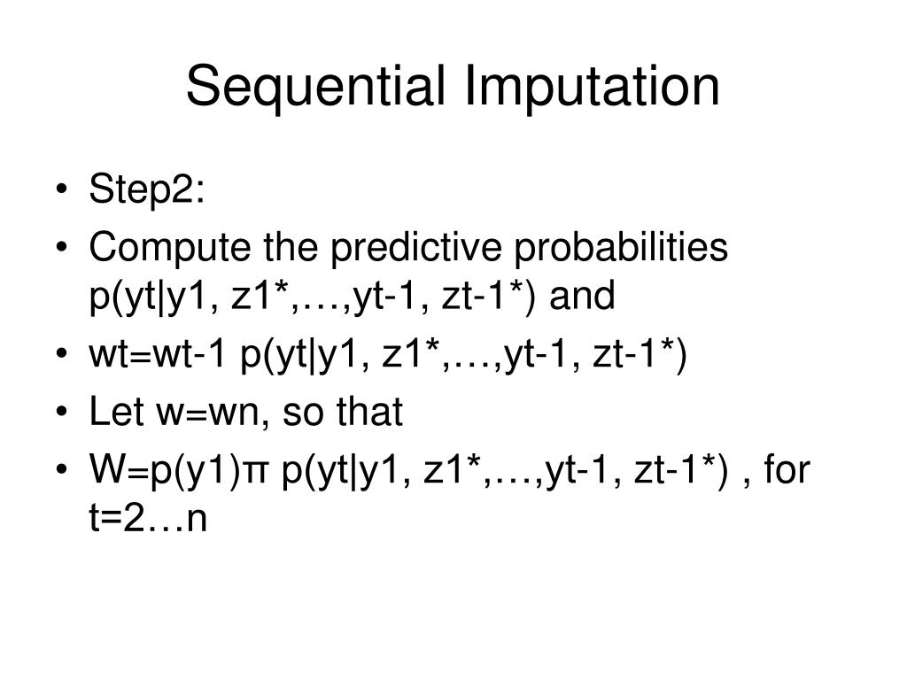 Sequential Imputation • Step 1: • Draw zt* from the conditional distribution p(zt|y1, z1*,…yt-1, zt-1*, yt). Notice that the zt*’s had to be drawn sequentially, because each zt* is drawn conditioned on the previously imputed missing part z1*,…,zt-1*