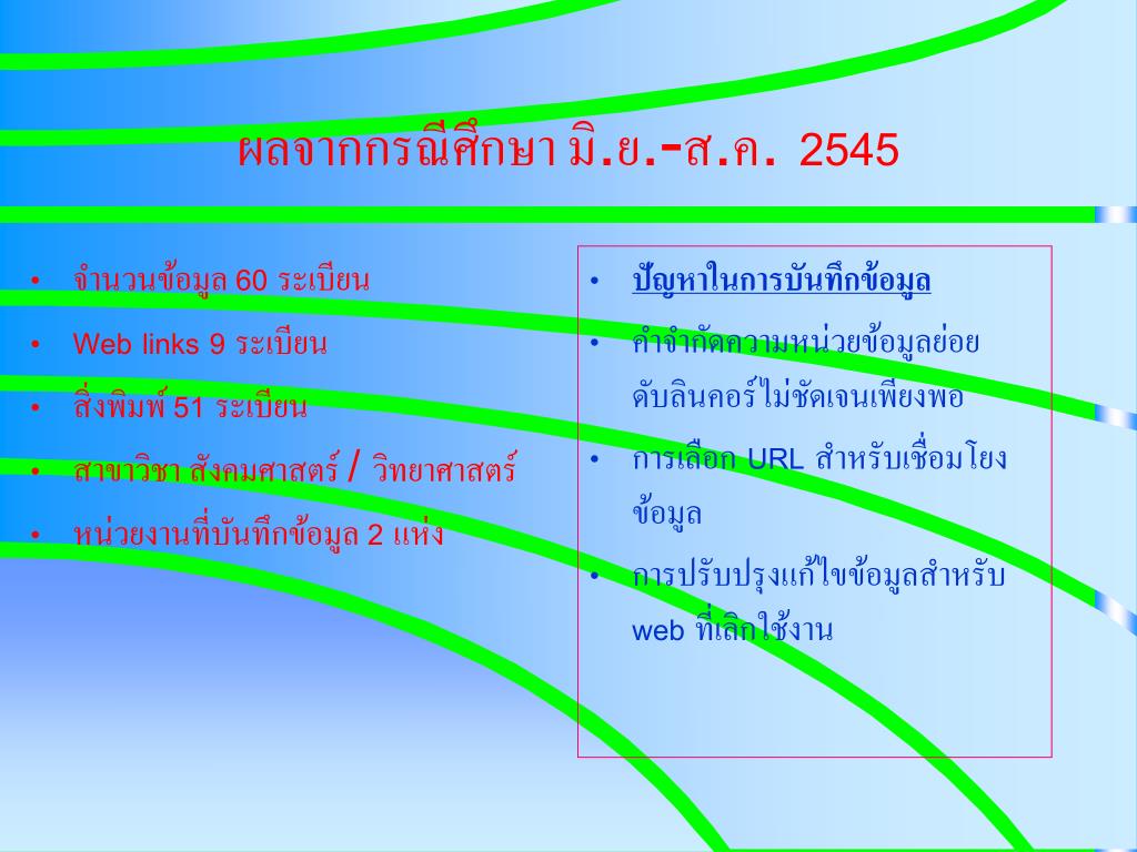 จำนวนข้อมูล 60 ระเบียน Web links 9 ระเบียน สิ่งพิมพ์ 51 ระเบียน สาขาวิชา สังคมศาสตร์ / วิทยาศาสตร์ หน่วยงานที่บันทึกข้อมูล 2 แห่ง ปัญหาในการบันทึกข้อมูล คำจำกัดความหน่วยข้อมูลย่อยดับลินคอร์ไม่ชัดเจนเพียงพอ การเลือก URL สำหรับเชื่อมโยงข้อมูล การปรับปรุงแก้ไขข้อมูลสำหรับ web ที่เลิกใช้งาน ผลจากกรณีศึกษา มิ.ย.-ส.ค. 2545