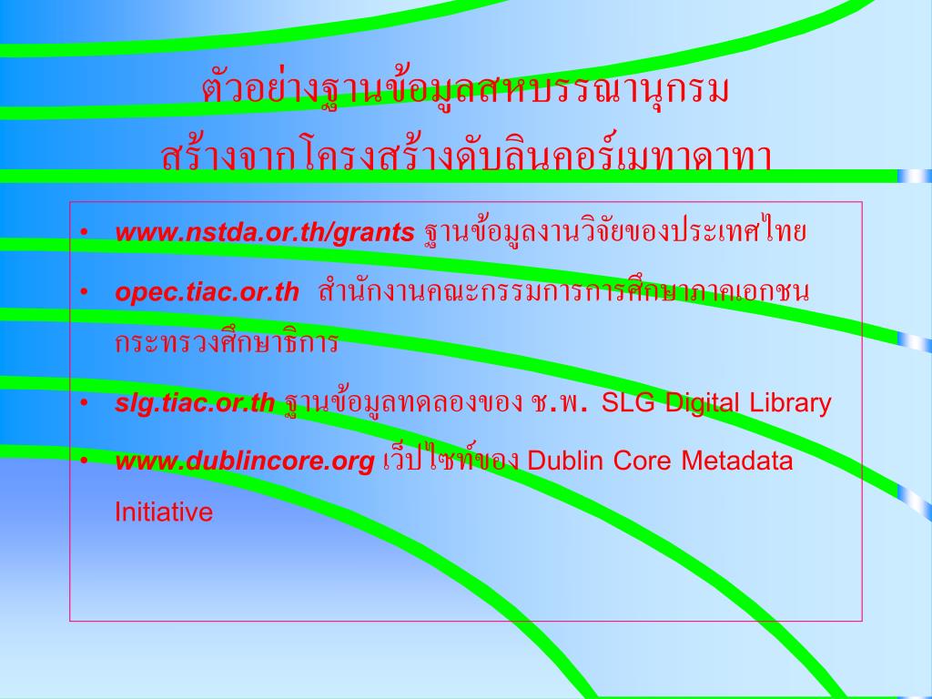 ตัวอย่างฐานข้อมูลสหบรรณานุกรมสร้างจากโครงสร้างดับลินคอร์เมทาดาทาตัวอย่างฐานข้อมูลสหบรรณานุกรมสร้างจากโครงสร้างดับลินคอร์เมทาดาทา • www.nstda.or.th/grants ฐานข้อมูลงานวิจัยของประเทศไทย • opec.tiac.or.thสำนักงานคณะกรรมการการศึกษาภาคเอกชน กระทรวงศึกษาธิการ • slg.tiac.or.thฐานข้อมูลทดลองของ ช.พ. SLG Digital Library • www.dublincore.orgเว็ปไซท์ของ Dublin Core Metadata Initiative