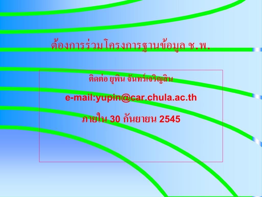 ต้องการร่วมโครงการฐานข้อมูล ช.พ. ติดต่อ ยุพิน จันทร์เจริญสิน e-mail:yupin@car.chula.ac.th ภายใน 30 กันยายน 2545