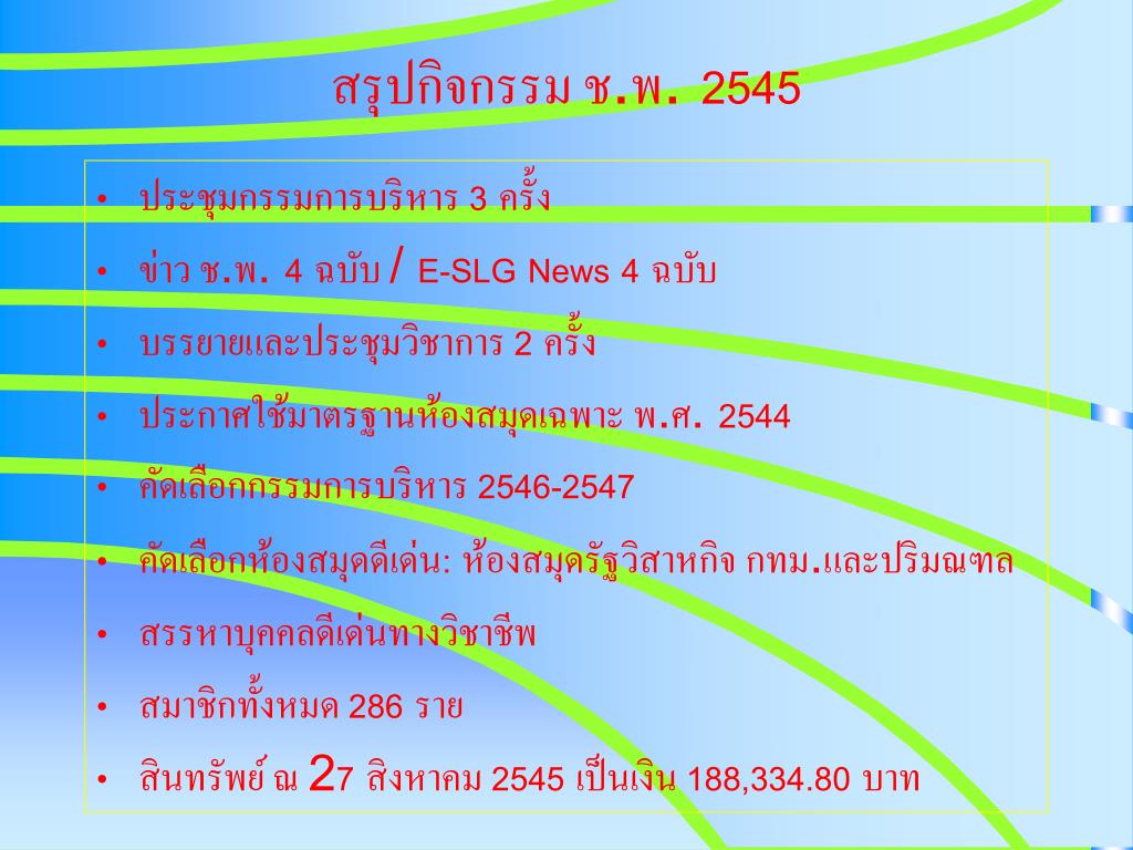 สรุปกิจกรรม ช.พ. 2545 • ประชุมกรรมการบริหาร 3 ครั้ง • ข่าว ช.พ. 4 ฉบับ / E-SLG News 4 ฉบับ • บรรยายและประชุมวิชาการ 2 ครั้ง • ประกาศใช้มาตรฐานห้องสมุดเฉพาะ พ.ศ. 2544 • คัดเลือกกรรมการบริหาร 2546-2547 • คัดเลือกห้องสมุดดีเด่น: ห้องสมุดรัฐวิสาหกิจ กทม.และปริมณฑล • สรรหาบุคคลดีเด่นทางวิชาชีพ • สมาชิกทั้งหมด 286 ราย • สินทรัพย์ ณ 27 สิงหาคม 2545 เป็นเงิน 188,334.80 บาท