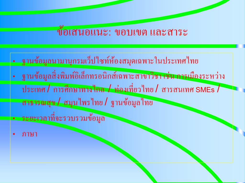ข้อเสนอแนะ: ขอบเขต และสาระ • ฐานข้อมูลนามานุกรมเว็ปไซท์ห้องสมุดเฉพาะในประเทศไทย • ฐานข้อมูลสิ่งพิมพ์อิเล็กทรอนิกส์เฉพาะสาขาวิชา เช่น การเมืองระหว่างประเทศ / การศึกษาทางไกล / ท่องเที่ยวไทย / สารสนเทศ SMEs / สาธารณสุข / สมุนไพรไทย / ฐานข้อมูลไทย • ระยะเวลาที่จะรวบรวมข้อมูล • ภาษา