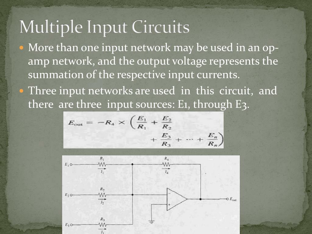 Multiple Input Circuits • More than one input network may be used in an op-amp network, and the output voltage represents the summation of the respective input currents. • Three input networks are used in this circuit, and there are three input sources: E1, through E3.