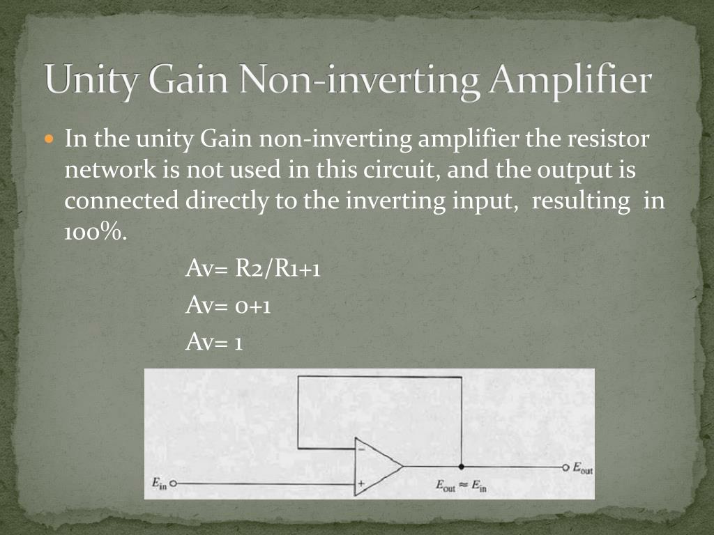 Unity Gain Non-inverting Amplifier • In the unity Gain non-inverting amplifier the resistor network is not used in this circuit, and the output is connected directly to the inverting input, resulting in 100%. Av= R2/R1+1 Av= 0+1 Av= 1